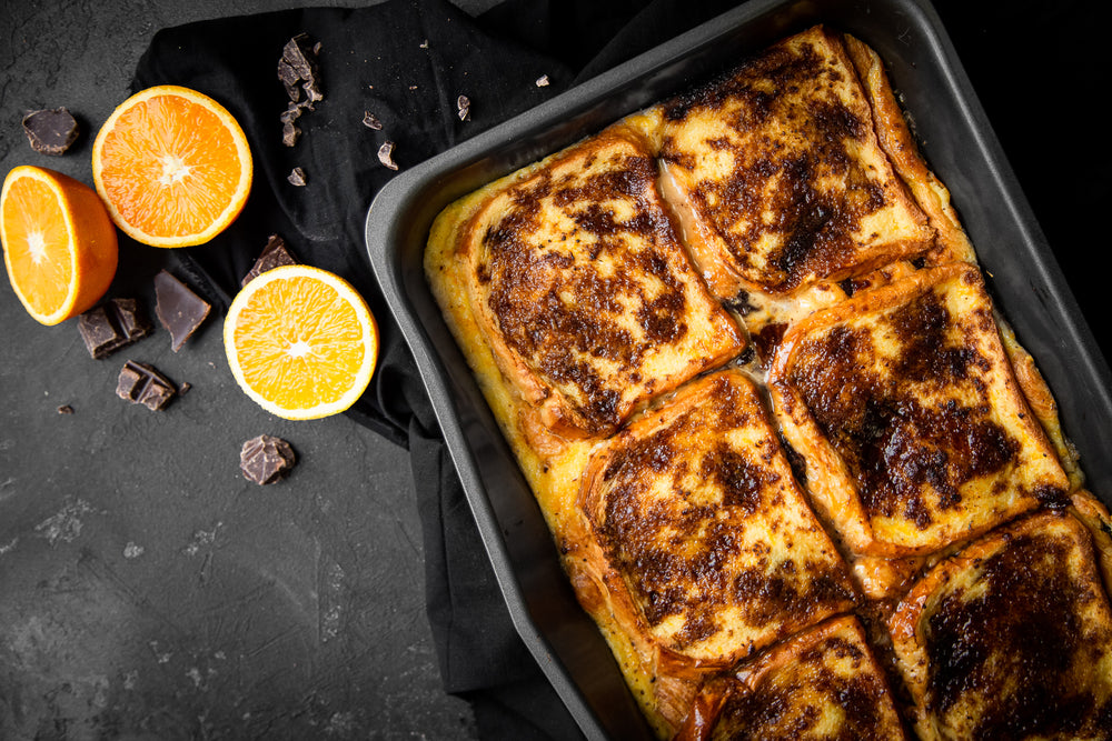 Sprinkle over chocolate chunks, followed by the final layer of brioche bread slices.