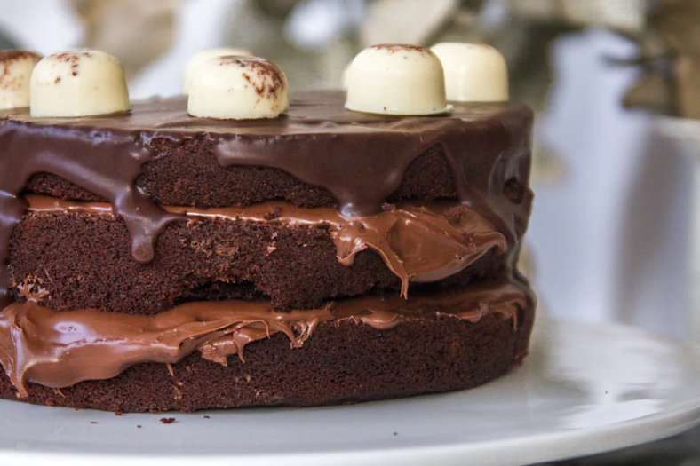 Place one layer of the chocolate sponge onto a cake stand. Using a small spatula, cover the top of the sponge cake with 100 g of the chocolate spread. Place the second layer of sponge on top of the chocolate spread and press gently. Spread the rest of the hazelnut over the second layer. Place the third sponge layer and press gently to make it level. Melt the dark chocolate in a chocolate melting pot and pour it gently over the Decadent Chocolate Cake. Once the white chocolate drops are cold, unmould them carefully and place them on top of the cake.