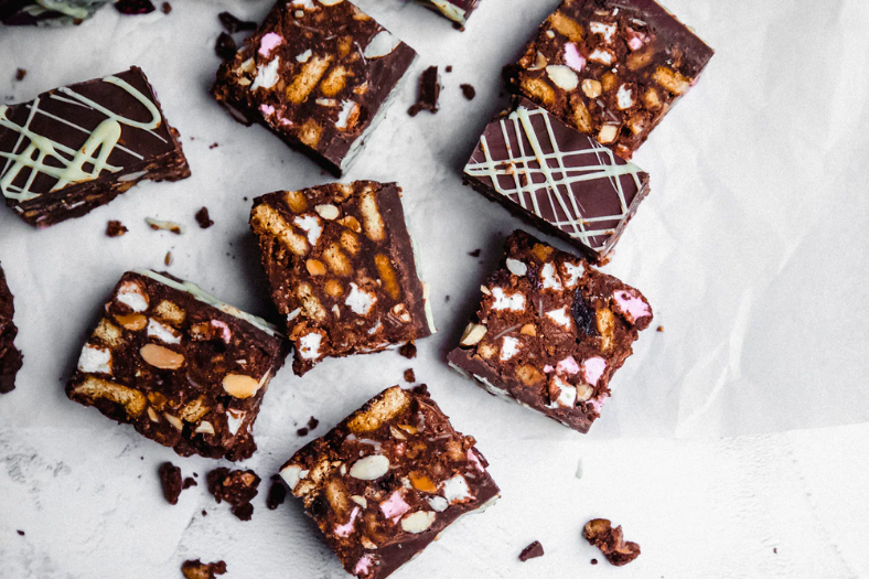 Line a 20cm square tin with parchment paper and pour the mixture in, using the back of a spoon smooth out the mixture, then drizzle the melted white chocolate over the top to decorate.
