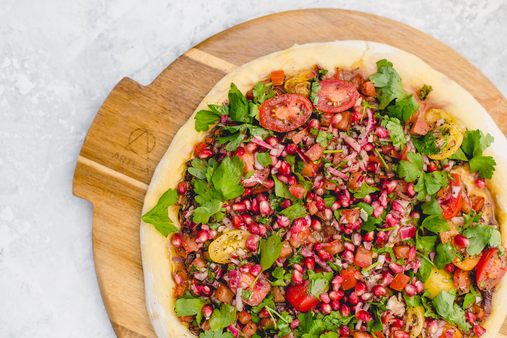 Using the pizza tray to bake the bread and topped with a Turkish tomato topping served with Labneh a Middle Eastern salted yogurt dip