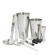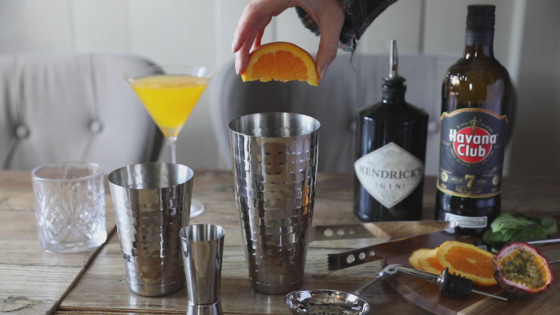 Full contents: a two-piece Boston shaker (the professionals' choice), a strainer (to ensure perfect smoothness), a double-sided jigger (for precision measuring) and ice tongs (for hygiene and flair), plus a bar spoon, a crown-cap bottle opener, and two bottle pourers.