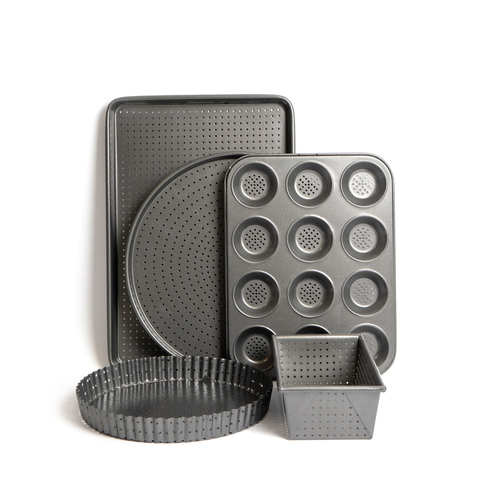 5pc Crusty Bake Non-Stick Bakeware Set with 25cm Quiche Tin, 32cm Pizza Crisper, 12-hole Yorkshire Pudding Tray, 2lb Loaf Pan and 32cm Baking Tray
