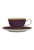 A BEAUTIFUL GIFT BOXED SET: treat yourself or a friend to this violet cup and saucer set, decorated with intricate border patterns